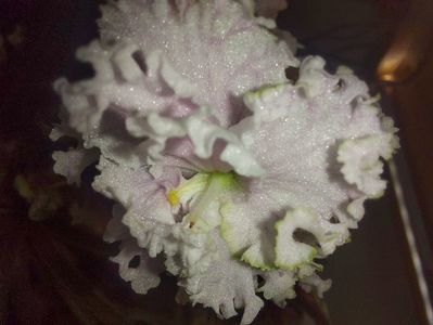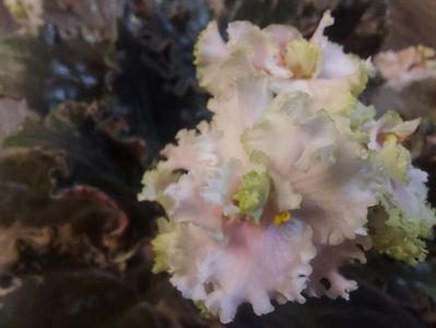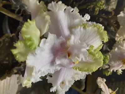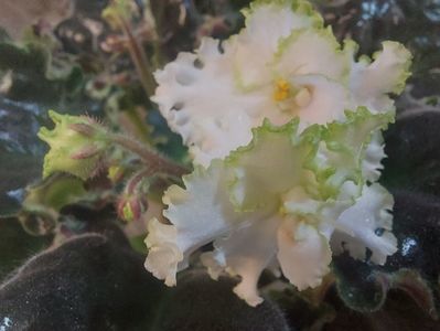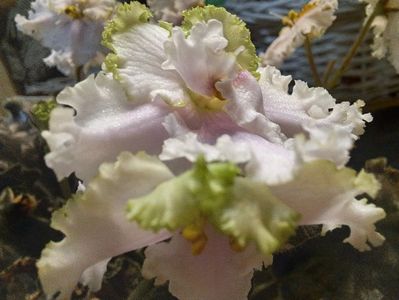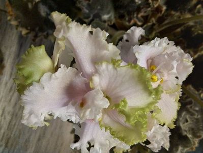 Pansee eliptice mari duble alb-verde, cu petale laterale adânc sculptate și ondulare groasă de dantelă de smarald de-a lungul marginii petalelor. O rozetă verde frumoasă de frunze ondulate festonate cu pestriță marginală. Acest soi uimește prin florile sale dantelate și frunzele dantelate!