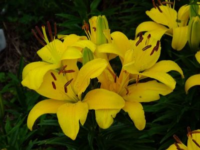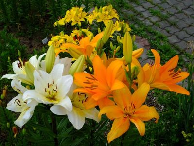 Jumatate din gradina e alocata bulbilor, iar cealalata trandafirilor. Unde avem bulbii fiecare are un desen cu alei pe unde se poate umbla. In fiecare toamna scoatem la ei de ne apuca Craciunul plantand inapoi. :)) Mutam sa facem rotatia culturii. La crini nu umblam asa des, nu le place sa tot fie deranjati. Pana acuma asa aveam doar bulbii pusi in zonele dedicate, pe la anul am in plan sa pun ceva anuale sa mai tina buruienile sub control, dar si sa fie zona mai mult colorata. La bulboasele de primavara nu merge varianta cu anuale, ca deja la sf de mai inceput de iunie incepem la scos bulbii. Dar la crini, irisi si dalii ar merge sa aiba ceva companioni anuali.Aici pe poteci pe unde umblam avem fie pietris in aranjamente, fie "iarba" unde sunt razoare normale, nu ceva desen creat.