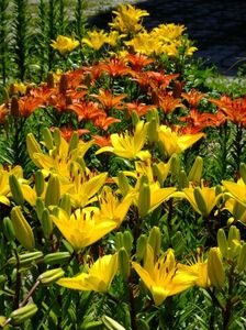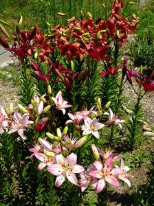 Jumatate din gradina e alocata bulbilor, iar cealalata trandafirilor. Unde avem bulbii fiecare are un desen cu alei pe unde se poate umbla. In fiecare toamna scoatem la ei de ne apuca Craciunul plantand inapoi. :)) Mutam sa facem rotatia culturii. La crini nu umblam asa des, nu le place sa tot fie deranjati. Pana acuma asa aveam doar bulbii pusi in zonele dedicate, pe la anul am in plan sa pun ceva anuale sa mai tina buruienile sub control, dar si sa fie zona mai mult colorata. La bulboasele de primavara nu merge varianta cu anuale, ca deja la sf de mai inceput de iunie incepem la scos bulbii. Dar la crini, irisi si dalii ar merge sa aiba ceva companioni anuali.Aici pe poteci pe unde umblam avem fie pietris in aranjamente, fie "iarba" unde sunt razoare normale, nu ceva desen creat.