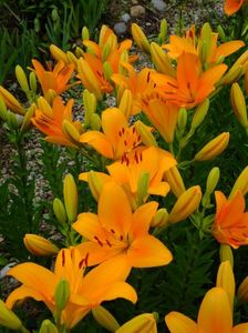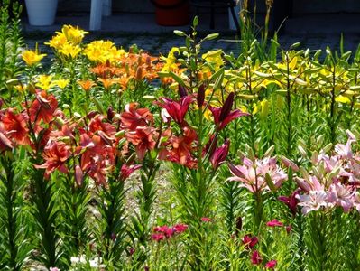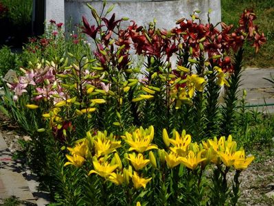 Jumatate din gradina e alocata bulbilor, iar cealalata trandafirilor. Unde avem bulbii fiecare are un desen cu alei pe unde se poate umbla. In fiecare toamna scoatem la ei de ne apuca Craciunul plantand inapoi. :)) Mutam sa facem rotatia culturii. La crini nu umblam asa des, nu le place sa tot fie deranjati. Pana acuma asa aveam doar bulbii pusi in zonele dedicate, pe la anul am in plan sa pun ceva anuale sa mai tina buruienile sub control, dar si sa fie zona mai mult colorata. La bulboasele de primavara nu merge varianta cu anuale, ca deja la sf de mai inceput de iunie incepem la scos bulbii. Dar la crini, irisi si dalii ar merge sa aiba ceva companioni anuali.Aici pe poteci pe unde umblam avem fie pietris in aranjamente, fie "iarba" unde sunt razoare normale, nu ceva desen creat.