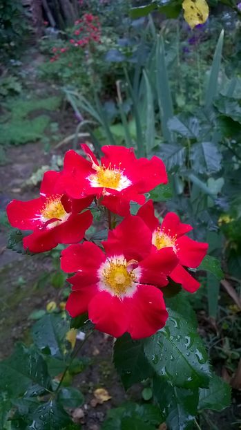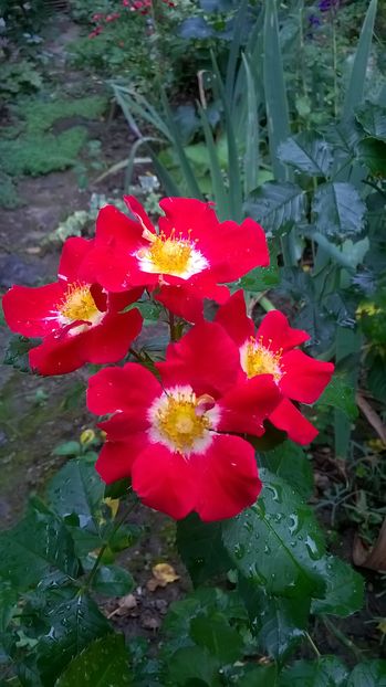 Crimson, white center, yellow stamens. Average diameter 4". Large, single (4-8 petals), cluster-flowered bloom form.