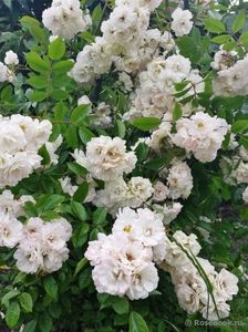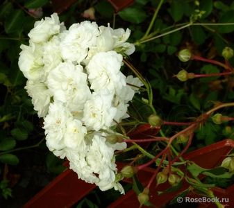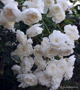 Un trandafir peisaj magnific care arată spectaculos în plină floare. Muguri de fildeș se deschid în flori duble albe. Sunt mici, adunate în perii de 3-5 bucăți. Înflorirea este atât de abundentă încât frunzele nu sunt vizibile în spatele florilor. Tufa crește rapid și este grozav pentru plantat pe o pantă, de unde poate atârna grațios. Când este crescut pe rădăcini, produce mulți descendenți de rădăcină, așa că trebuie limitat. Foarte rezistent la boli.