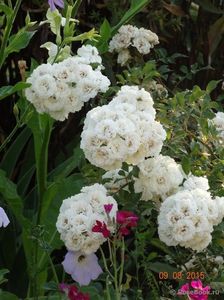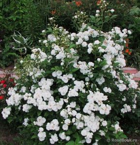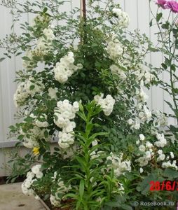 Acest trandafir are cu siguranță mai multe plusuri decât minusuri. Înflorirea este într-adevăr fără întrerupere și nu în flori individuale, ci în perii mari. Culoarea este alb pur, toamna la temperaturi scăzute florile pot deveni roz. Rezistență la iarnă foarte mare. Dintre minusuri - nu se estompează frumos, se limpezește singur, dar foarte, foarte încet. Îl poți tăia pentru iarnă, sau poți salva biciurile. Tăierea de toamnă nu afectează abundența înfloririi, singura întrebare este ce tufiș doriți să aveți - la urma urmei, este un scrub și poate ocupa mult spațiu.
