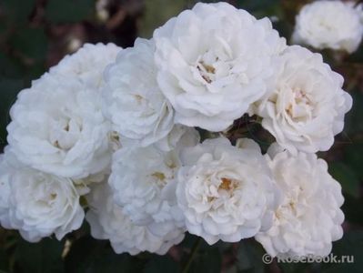 White. None / no fragrance. 50 to 55 petals. Average diameter 1.5". Small, very full (41+ petals), cluster-flowered, in small clusters, in large clusters bloom form.